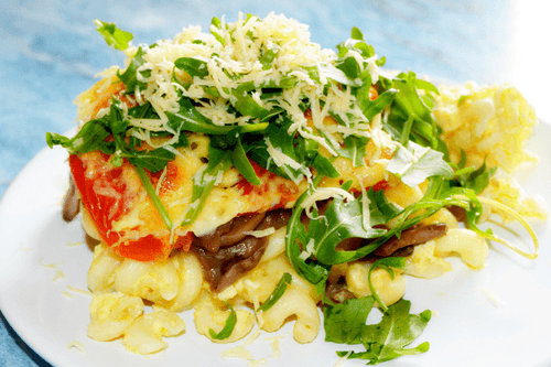 Casserole of macaroni with cheese, tomatoes and mushrooms