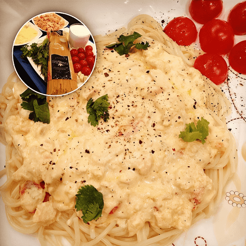 Mix with spaghetti or pour the sauce over the spaghetti, garnish with greens.