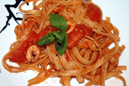 We mix tomatoes with garlic, add finely chopped basil (or dried), salt and pepper, shrimp, and then a small can of tomato paste.