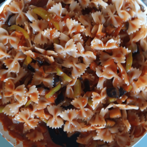 Farfalle with tomato sauce and vegetables