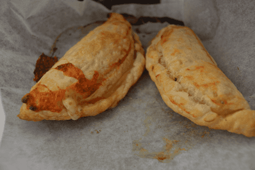 Place the filling on one half of the dough circle, seal the edges like in chebureks. Do the same with the remaining calzone bases.