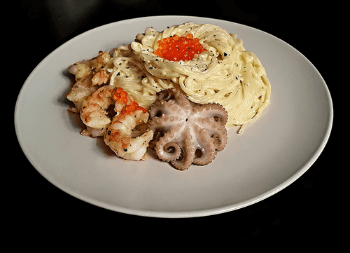 Place the pasta on a plate, top with a spoonful of red caviar, arrange the octopuses and shrimp, and sprinkle a little parmesan and freshly ground pepper on top.