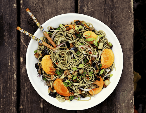 Noodles with eggplant and persimmon