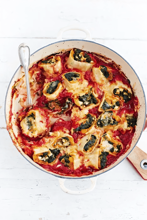 Wrap the filling in pasta sheets to make tubes. Cut each into 2 pieces and place them upright tightly next to each other in the sauce.