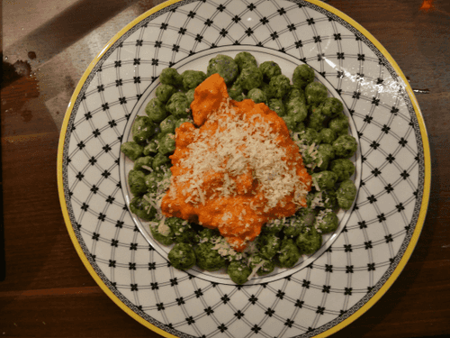 Drop the ready gnocchi in portions into boiling salted water and cook for 3-4 minutes after they float. Serve on plates, drizzle with sauce, sprinkle with remaining parmesan - and enjoy! I love eating gnocchi with a spoon to scoop up more sauce.