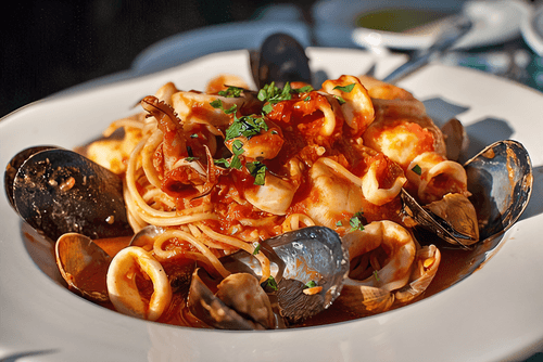 Save a glass of the water in which the pasta was cooked for the sauce. Drain the cooked pasta, then return it to the pot and put it back on the heat. Pour the tomato sauce, the glass of pasta water, and finally the seafood into the cooked spaghetti. Stir on the heat before serving.