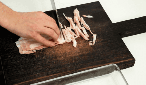 Fry the bacon until golden brown. Add black pepper and chili, and mix well.