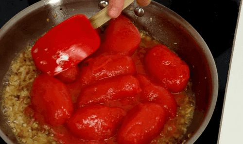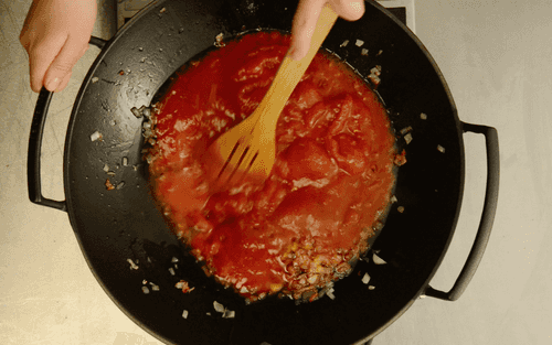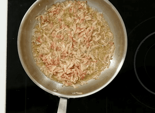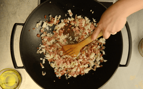 Finely chop the onion and garlic, combine with bacon (or pancetta, as done in Rome). Fry, stirring constantly, until the onion is soft and translucent.