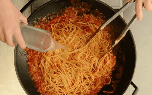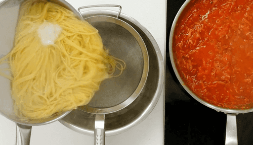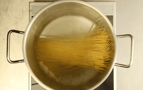 Meanwhile, boil water, add salt, and throw in the spaghetti.
