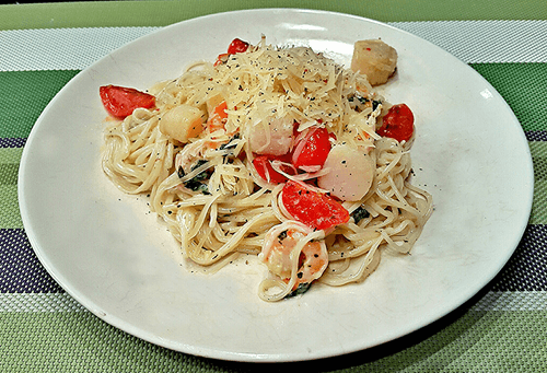 Spaghetti with scallops in creamy sauce