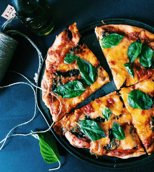 When the pizza is ready, add a couple of basil leaves. Enjoy your meal!