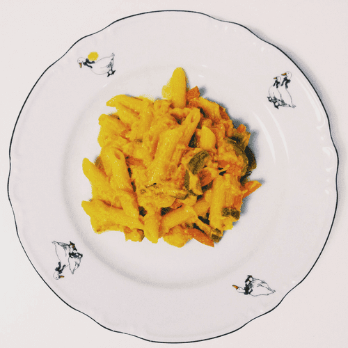 Penne with pumpkin, vegetables and shrimp