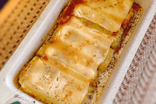 On warm, but not hot pasta, we place our filling and roll it into a tube – we put the finished one in the baking dish.