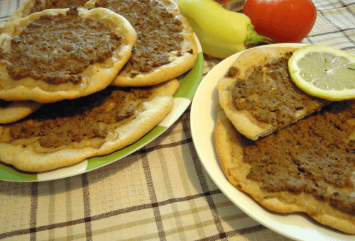 Divide the dough into pieces, form balls from them and roll each into a thin flatbread with a diameter of 12 cm. Place the filling on the flatbreads. Line a baking tray with parchment paper, arrange the flatbreads (or place them on a rack) and put in an oven preheated to 180°C. When the dough turns golden brown, about 10 minutes later, the lamaj is ready. Serve hot, drizzled with lemon juice.