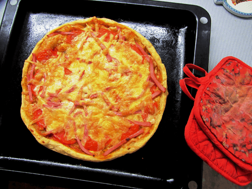 Place the dough on a baking sheet, spread it with ketchup, add fried onions, then tomatoes, and cover everything with melted cheese. Put the baking sheet in a preheated oven at 200°C. Bake for 20 minutes.