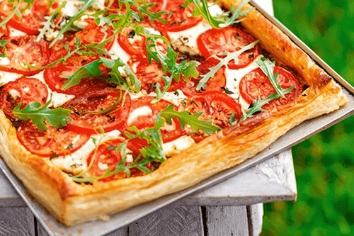 Tomato and pesto tart is a vibrant embodiment of summer flavors from Italy. This simple yet elegant pie combines crispy puff pastry, aromatic homemade arugula pesto, and juicy tomatoes of various varieties, creating a harmonious blend of freshness and depth of flavor. The pesto made with pine nuts and parmesan adds rich nutty and cheesy notes that complement the sweet-sour tones of the tomatoes. This dish captures the spirit of Mediterranean cuisine: it works wonderfully as an appetizer or light dinner, especially in warm weather. The tart is airy with a delicate texture, and its rich flavor becomes even more pronounced with a hint of garlic and olive oil. It pairs perfectly with a glass of white wine or fresh lemonade.