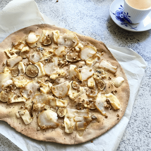 Pizza with pear and brie cheese on whole grain dough