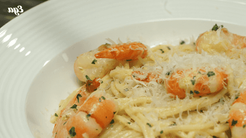 Pasta with shrimps in creamy garlic sauce