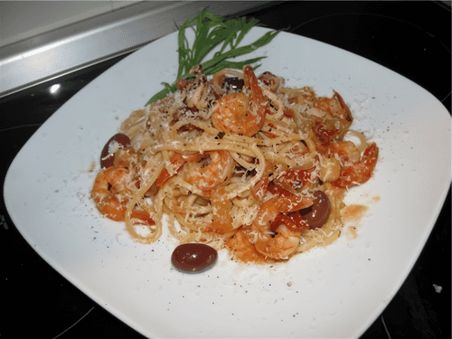 Wash fresh squid, clean off the membranes, and cut into strips. Clean the shrimp. Boil the pasta until ready. Take the quantity of ingredients as you like.