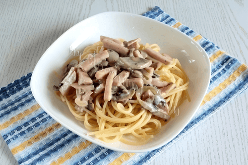 We serve the pasta hot with a sauce of ham and mushrooms.