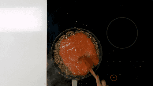 5-7 minutes before it's ready, add chopped tomatoes to the minced meat in the pan, mix well and simmer until the tomato juice evaporates slightly and the mixture thickens.