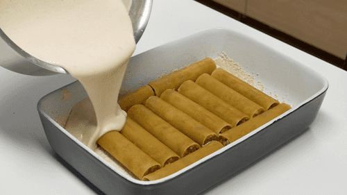 Pour the béchamel sauce on top, cover with a lid or foil, and bake in the oven at 160–180 degrees for 35–40 minutes.