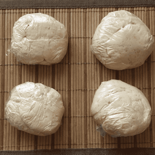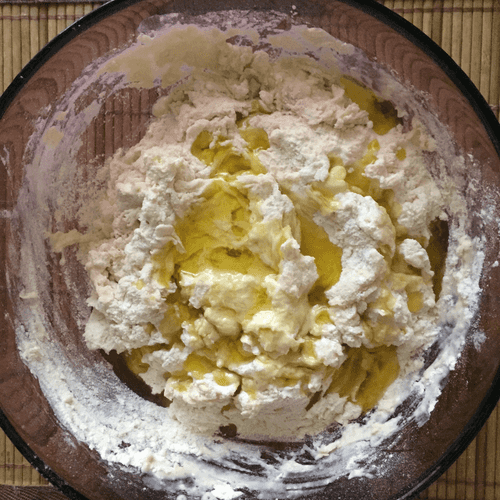 Add olive oil and knead the dough by hand. Cover the dough with plastic wrap and let it rest for 5–10 minutes.