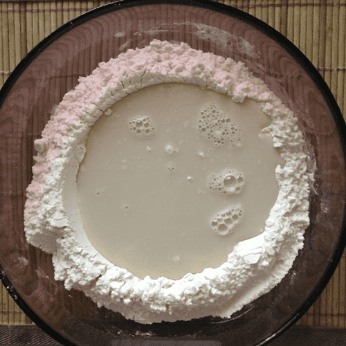 Dissolve live yeast in warm water until fully dissolved. Add to the mixture (1) and gently stir with a spoon.