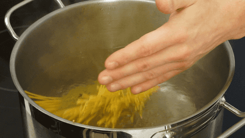 Add the spaghetti there and mix well until the boiling stops. Most of the water should evaporate.