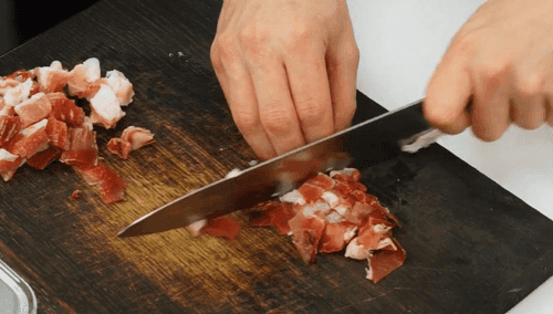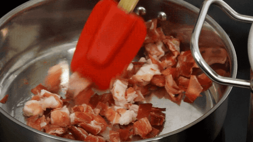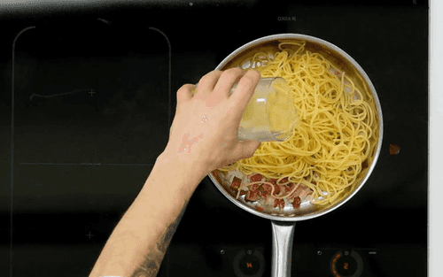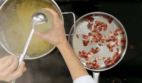 Return the pan with pancetta to low heat, add about 50 ml of pasta broth.