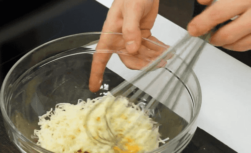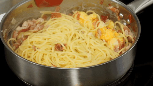 Remove the pan from the heat and add the yolks with cheese, stirring quickly until the yolks thicken. If the sauce seems too thick, add a bit more pasta broth.