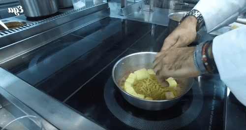 Add diced potatoes to the onion, sauté, and pour in water. Cook until 'al dente' for 5-10 minutes.