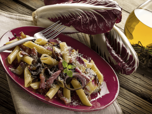 Add a tablespoon of olive oil to the pan and sauté the pancetta cubes with onion. When the pancetta turns golden, add the radicchio to the ingredients, mix, and remove from heat.