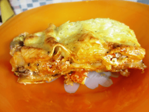 Place lasagna sheets on the last layer of filling again. Pour the remaining sauce on top and sprinkle the lasagna with cheese.