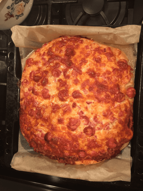 Roll out the dough to the desired size, spread the sauce, add sausages, ham, and sprinkle everything with cheese (I do this in 2 layers for more filling).
