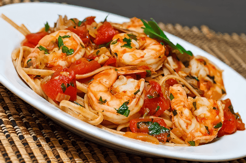 Spaghetti with shrimps and tomatoes