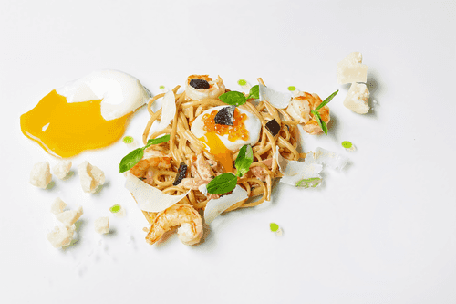 Linguine carbonara with shrimp is an exquisite version of classic Italian pasta, combining delicate seafood notes with a rich creamy flavor. The roots of carbonara trace back to Italian cuisine, traditionally made with guanciale and egg. In this recipe, shrimp replaces bacon, adding freshness and sophistication to the dish. The linguine absorbs the aromas of creamy and truffle oil, while the addition of red caviar and parmesan makes the taste rich and deeply balanced. The poached egg adds a creamy texture, and basil adds a light spiciness. This dish is perfect for a romantic dinner or special occasion, highlighting the elegance of Italian cuisine.