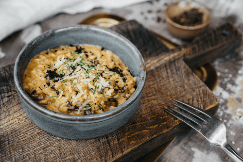 When the rice is almost ready, remove from heat, add grated parmesan and a piece of butter. Stir with a spatula until smooth.