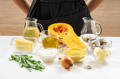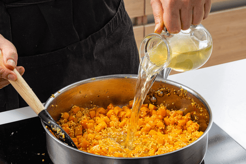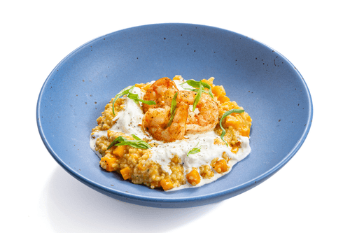 Millet risotto with pumpkin and shrimp is a unique gastronomic experience that combines Italian classic with unexpected ingredients. Millet adds softness and a nutty flavor to the dish, while sweet pumpkin harmonizes with the seafood taste of shrimp. The origins of risotto trace back centuries into Italy's culinary traditions, where slow cooking with broth creates a delicate texture. White wine adds a slight acidity, while parmesan and stracciatella contribute creamy richness. The dish is aromatic, velvety, and incredibly refined. It is served as an elegant main course or a vibrant accent for festive dinners, with tarragon bringing freshness and a spicy note. Risotto is best enjoyed immediately after preparation when its texture remains creamy and the aromas are fully revealed.