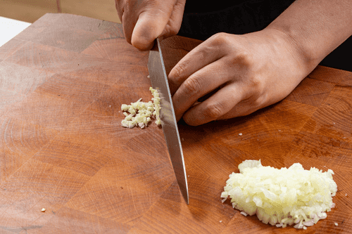 Chop the onion and garlic clove finely.