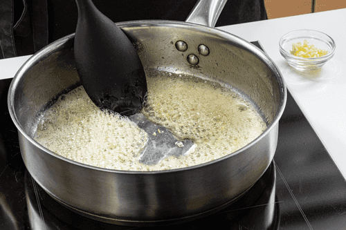 In a deep skillet, heat olive oil and half of the butter and sauté the onion until translucent. Then add garlic and sauté for 30 seconds.