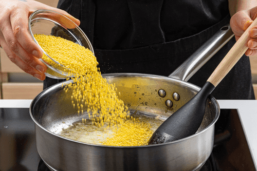 Continue to add broth gradually, stirring the risotto with a spatula for about half an hour. The millet should retain its shape and not overcook.