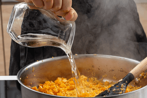 Pour in the wine, simmer for 3 minutes to evaporate the alcohol, then add half of the broth and simmer on low heat until the broth evaporates.