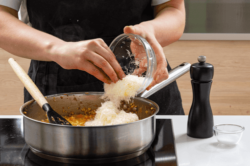 When the millet is almost ready, add grated parmesan, mix it, then taste and season with salt and pepper to your liking.