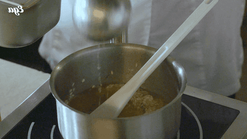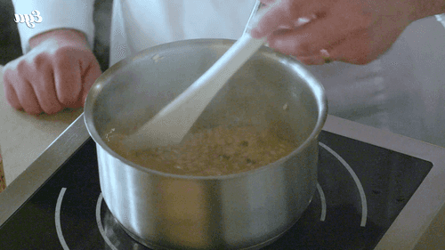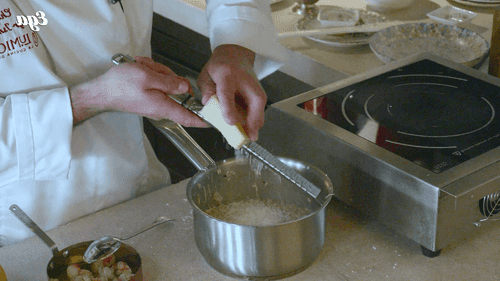 Remove the cooked risotto from the heat, add butter and grated cheese, and stir actively.