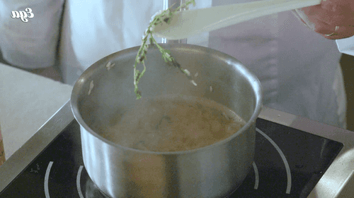Take out the thyme and garlic, they are no longer needed.