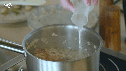 Pour in the wine and evaporate it for 2 minutes. Add a ladle of broth, it should slightly cover the rice.
