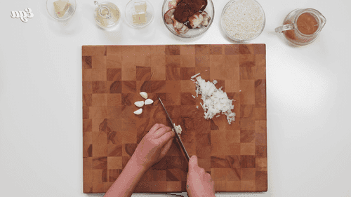 Heat olive oil, sauté onion until translucent. Add garlic and sauté for another minute.