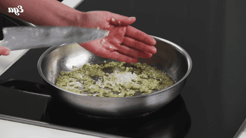 Gradually pour broth into the pan, stirring regularly, and bring the risotto to an al dente state. Season with salt and pepper.