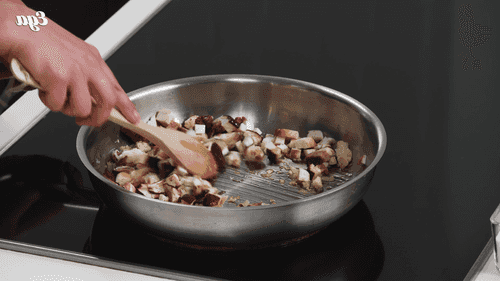 In a separate pan, heat 20 grams of butter and sauté sliced mushrooms until golden brown. Season with salt and pepper.